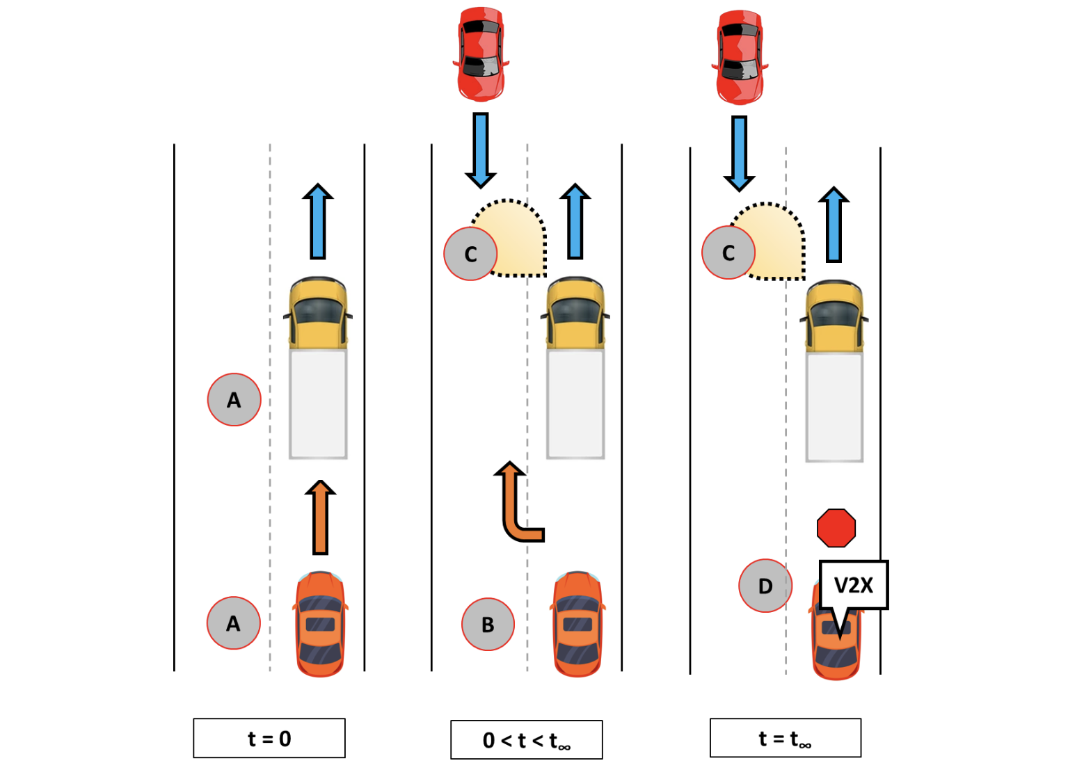 This system alerts the driver and LKA system when a passing maneuver could cause a head-on collision. Using onboard detection and V2V, it prevents overtaking in unsafe conditions. It can also issue alerts when drifting across the center line due to distraction, fatigue, or medical emergencies.
